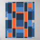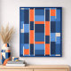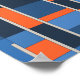 A modern geometric abstract design composed of adjacent rectangles and squares in light blue, dark blue, and orange, separated by thin light grey lines. The layout forms parallel horizontal rows with a balanced repetition of colours and shapes, creating a rhythmic and structured visual appearance reminiscent of a tiled wall or contemporary mosaic artwork.