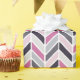 Geometric chevron pattern gift wrap in accents of purple, pink and grey.