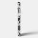 Phone case in a geometric daisy pattern in deep red / crimson on a black and white patterned background