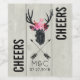 A wedding label for wine bottle personalised with your initials and wedding date and Cheers written along the side. Designed with a black deer head made with geometric lines and wearing a pink floral crown and crossed arrows below. Rustic and trendy design. The background is a digital image of soft beige coloured wooden planks.