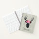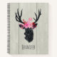 A personalised spiral notebook with a black deer head made with geometric lines and wearing a pink floral crown. Rustic and trendy design. The background is a digital image of a wooden texture.