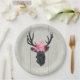 Paper plates with a black deer head made with geometric lines and wearing a pink floral crown. Rustic and trendy design. The background is a digital image of a wooden texture.