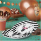 Paper plates with a black deer head made with geometric lines and wearing a pink floral crown. Rustic and trendy design. Background is a pattern with black and white stripes.