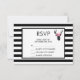 Wedding or other event RSVP card with a black deer head made with geometric line and wearing a pink floral crown. Rustic and trendy design. The background is a black and white striped pattern with a white frame with a black border layered over top.