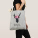 A personalised tote bag with a black deer head made with geometric lines and wearing a pink floral crown. Rustic and trendy design. The background is a digital image of some wood.