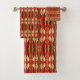 This towel set features a geometric, abstract design composed of stripes, curves, chevrons, and lines in colours of the American Southwest desert: yellow, green, blue, red, orange, and more. Beautiful and unusual design.