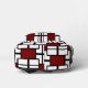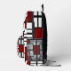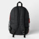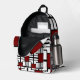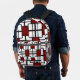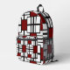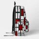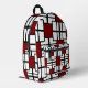 This bold, stylish backpack features a vibrant red, black, and white geometric design inspired by modern art.