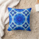 Throw pillow in a geometric flower pattern in deep cobalt blue and navy / indigo, on white accented with turquoise
