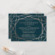 A modern and contemporary winter engagement party invitation, features a "faux foil" gold rose geometric pattern over a dark turquoise background. All your details are spelled in a beautiful modern typo.