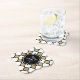 This paper coaster features a bold geometric quatrefoil pattern in black, white, and faux gold glitter. Personalise it with your white monogram in a black frame.