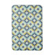 This mid-century modern pattern features gold and blue shapes.