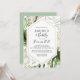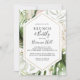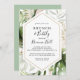 This geometric gold brunch and bubbly bridal shower invitation is perfect for a destination wedding shower. The design features hand-painted watercolor gold and green palm and banana leaves with pink flowers bunched into bouquets, adorning a geometric frame.