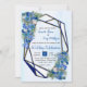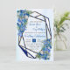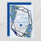 Geometric gold-navy frames with blue corn-flowers, white roses & arum-lilies, blue spring flowers with a light blue textured paper background