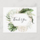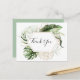 This geometric gold tropical greenery thank you postcard is perfect for a destination wedding. The design features hand-painted watercolor gold and green palm and banana leaves with pink flowers bunched into bouquets, adorning a geometric frame.