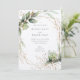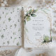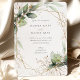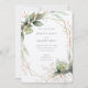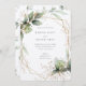 This elegant wedding invitation combines the natural charm of watercolor greenery with the sophisticated sparkle of faux gold accents. A geometric arrangement adds a modern twist to the organic eucalyptus leaves, showcased in varying shades of jade, seafoam, and hunter green. The invitation is framed with delicate gold splatters and branches, adding a touch of luxury. Perfect for a chic and contemporary wedding, this invitation will enchant your guests with its unique blend of classic botanical beauty and modern design elements.