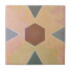 A stunning ceramic tile featuring a hexagon at its center surrounded by four triangles, all outlined in soft cream. The tile's background is a swirl of warm pastel hues, including peach, pink, yellow, and muted blue tones, creating a harmonious and artistic aesthetic. Perfect for modern and bohemian decor.