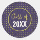 This bold, modern design features an eye-catching pattern of small gold triangles on a trendy purple background with a circle in the centre, surrounded by smaller gold circles. Inside the circle is the text, "Class of" in gold in popular hand lettered script typography. Below this text is a customisable graduation year in white in popular typopgraphy. Simply change the year to personalise this item for yourself, a classmate, or a loved one. These stickers makes great gifts or favours for a graduation party or a class reunion.