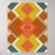 This design features a bold, symmetrical arrangement of geometric shapes in earthy tones, including shades of orange, yellow, brown, and teal. The overlapping chevron patterns create a dynamic sense of movement and balance, reminiscent of vintage 1970s aesthetics. The contrast between the warm and cool colours adds depth and vibrancy to the design, making it ideal for use in interior decor, textiles, or graphic art.