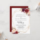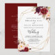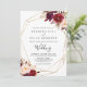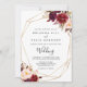 This geometric rustic boho floral front and back wedding invitation is perfect for a simple wedding. The design features pink, purple, red, and burgundy watercolor peonies clustered into elegant bouquets with green foliage, embellishing a gold geometric frame.