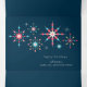 This modern holiday card showcases a collection of bold, geometric snowflakes against a deep navy blue background. Each snowflake is meticulously crafted in vibrant colours of red, blue, and gold, offering a striking visual contrast. The minimalistic "Happy Holidays" message subtly complements the design, making it perfect for sending festive cheer during the holiday season. This card is ideal for those who appreciate a clean, contemporary aesthetic while maintaining the warmth and tradition of holiday celebrations.