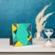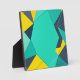 An abstract geometric design featuring a bold central cyan or teal hexagon, framed by a complex mosaic of brightly coloured triangles and polygons. The surrounding shapes utilise a palette of yellow, dark navy blue, and various teal shades. Some of the darker and teal sections incorporate subtle linear patterns and thin white vector lines, adding texture and depth to the otherwise flat, clean design. This piece evokes a modern, sharp, and dynamic energy.