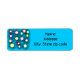 These return address labels have a geometric design of circles of different colours with lines coming out on a field of blue.