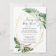 Trendy tropical leaves and white magnolias drive through bridal or baby shower invitation with gold geometric frame.
