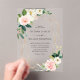 Invite guests to your wedding with our customisable acrylic wedding invitation. It features a beautiful watercolor design of white, peach, and pink roses and peonies framed by a luxurious faux foil geometric border. This exquisite combination of soft florals and bold geometric accents creates a sophisticated, contemporary invitation.