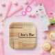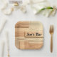 Geometric wooden panels are arranged against a textured sand backdrop, creating a visually interesting contrast between the smooth wood grain and the fine sand.