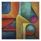 Geometric shapes in vibrant colours intertwine in a visual dialogue between curves and angles. The composition reveals balance and contrast, as if each colour and line were pieces of an artistic puzzle that unites reason and emotion.