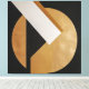 An abstract composition merging a golden circle, dark triangle, and white stripe in elegant contrast. The artwork conveys balance between strength and subtlety, exploring the dialogue of geometric forms, light, and shadow, evoking modernity and timeless sophistication.