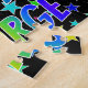 This vibrant and exciting birthday-themed jigsaw puzzle design features the message "HAPPY BIRTHDAY, GEORGE" with the characters having a colourful rainbow spectrum inspired gradient pattern, in addition to a fun star shapes background pattern. A colourful puzzle like this might be used to send birthday wishes to somebody named George. [~Z0000468]