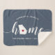 Show some home state pride with this cute rustic blue throw blanket featuring "home" in white calligraphy script lettering with a silhouette map of the state of Georgia standing in for the letter "O." A red heart illustration inside the state map completes the design; you can change the position of the heart to your home city by opening the design tool and dragging the heart shape to your favourite spot. Personalise with your home city, family name and year established to create a perfect and memorable housewarming gift or addition to your new home.