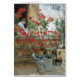 Geraniums (1888/89) by Childe Hassam is a vintage fine art impressionism floral painting. There are two watering cans in the foreground and the lady appears to be relaxing by reading a book. A portrait of a woman sitting near potted geranium plants with blooming red flowers from the garden.