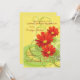 A cheerful invitation featuring three gerbera daisies in a bright red colour. The sunny, yellow background has abstract foliage and swirls. Suitable for any happy celebration.