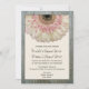 A wedding invitation featuring an image of a pink and off white gerbera daisy at top. Border on all sides is barnwood. Back is barnwood. Personalise the text with details of your occasion.