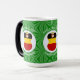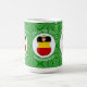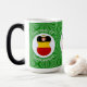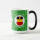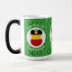 Magic morphing mug features a German angel, dressed in the flag of Greece, inside a white, fractal circle of squiggly squares. The circle is on a green fractal background of squiggly squares. Add a name, holiday, and year to personalise your mug as a gift or to add to your holiday decorating. Lovely for Christmas decor. Design shows on three sides of mug. Use the "edit design" option to change the font and/or colour of the name, holiday and year.