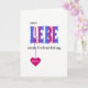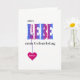 This is a pretty birthday card for a german friend or relative. The word LIEBE on the front is in blue-pink colored capital letters overlaid with a pattern of white flowers. The greeting is "Alles Liebe zum Geburtstag" (= "With love on your birthday"). A deep pink heart hangs from the letter L, and this can be personalized with your preferred name or text.