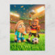 A triumphant German bratwurst in a national soccer jersey celebrates victory while a disappointed Argentinian empanada stands beside the ball. The characters feature expressive faces, clean vector‑like lines, and soft 3D shading. Stadium lights, confetti, and detailed grass create a lively soccer celebration atmosphere.