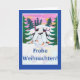 A fun Christmas Card with Merry Christmas in German and two penguins ice-skating in a winter landscape, from a handpainted paper collage by Judy Adamson. The inside is left blank for your own message and please contact me through my store if you would like the front cover text changed.