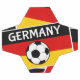 The flag of Germany, tricolour, displaying the national colours of Germany: black, red, and gold. In the middle there picture of a black and white, soccer ball / football. The text, in white reads Germany.