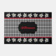German inspired door mat done in a black and white check pattern, with red accents and graphics of Edelweiss flower borders. Red custom text, in the middle of the mat, reads Welcome in German, Willkommen, and can be changed to read what you want.