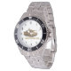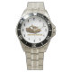 Has heft and feel of expensive stainless steel quartz watches. Good band with safety catch. I removed links, which is easy because engraved arrows show direction to push the linking pins. As always by this seller, the image (a railroad logo) is a perfect reproduction of my emailed image, and is precisely spaced and aligned.