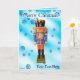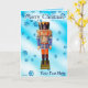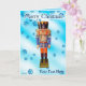 A traditional German wood nutcracker depicting a military officer with a blue and orange uniform. The nutcracker is superimposed on a blue background image with snowflakes. Text reading "Merry Christmas" also appears. Add your own additional text.