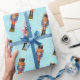 A traditional German wood nutcracker depicting a military officer with a blue and orange uniform. The nutcracker is superimposed on a snow background image.