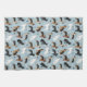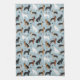 Cute German Shepherds in black and tan, black and red, black and silver, white and back colour coats sit and stand with scattered dog bones and paw prints on a light blue background.