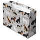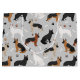 Cute German Shepherds in black and tan, black and red, black and silver, white and back colour coats sit and stand with scattered dog bones and paw prints on a light grey background.