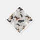 Cute German Shepherds in black and tan, black and red, black and silver, white and back color coats sit and stand with scattered dog bones and paw prints on a light gray background.