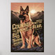 A German Shepherd stands proudly on a rocky outcrop, looking towards the setting sun. The words Courage is not the absence of fear, but the triumph over it are superimposed on the image.