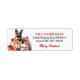 A beautiful German Shepherd Dog lying upon a stack of red and white Christmas gifts is at the left on these return address labels. Your custom text is in red and black at the right. There's also an extra text field for your seasonal greeting in red.